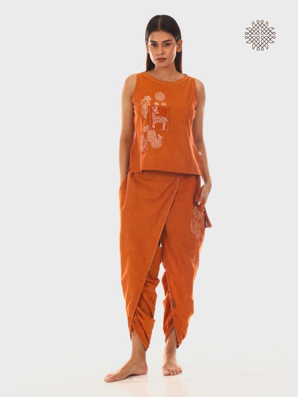 Chital - Hand Block Printed Rusty Brown Dhoti & Crop Top Set made in 100% cotton