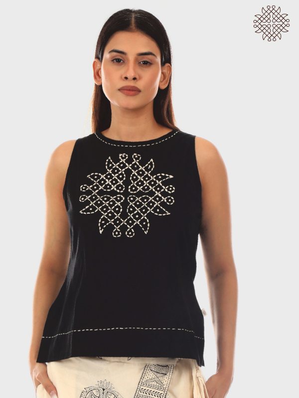 Rangavalli - Hand Embroidered Sleeveless Black Crop Top crafted in 100% cotton.