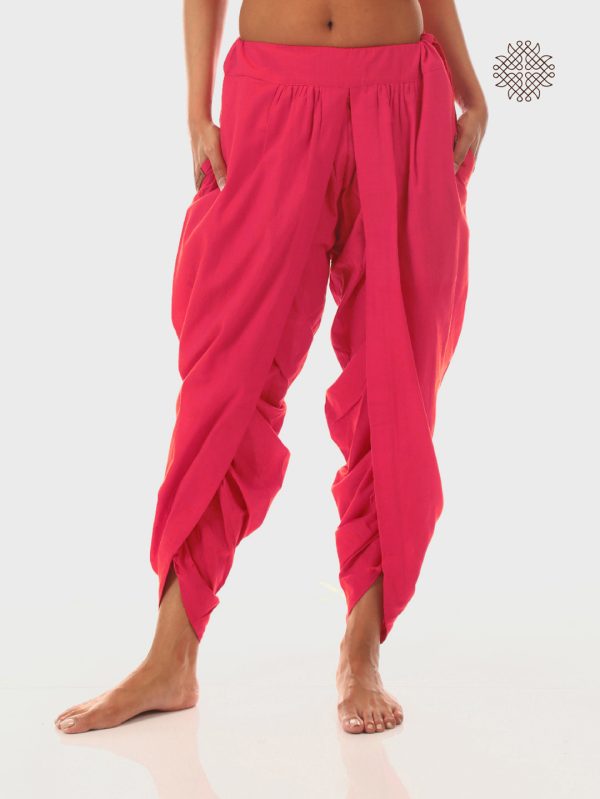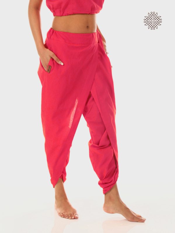 pATala (coral pink) taruNi, cross-cut stylish dhoti pants with pockets form a comfy wrap crafted in 100% cotton