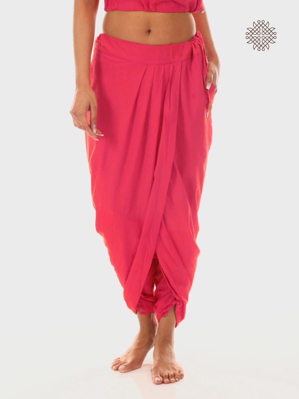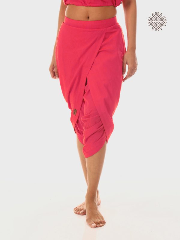 pATala (coral pink) yuvaki, pleated dhoti pants form a comfy wrap crafted in 100% cotton
