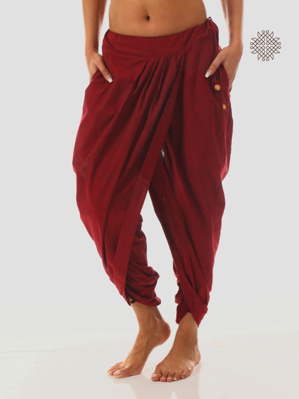 kumkum (maroon) yuvaki, pleated dhoti pants form a comfy wrap crafted in 100% cotton
