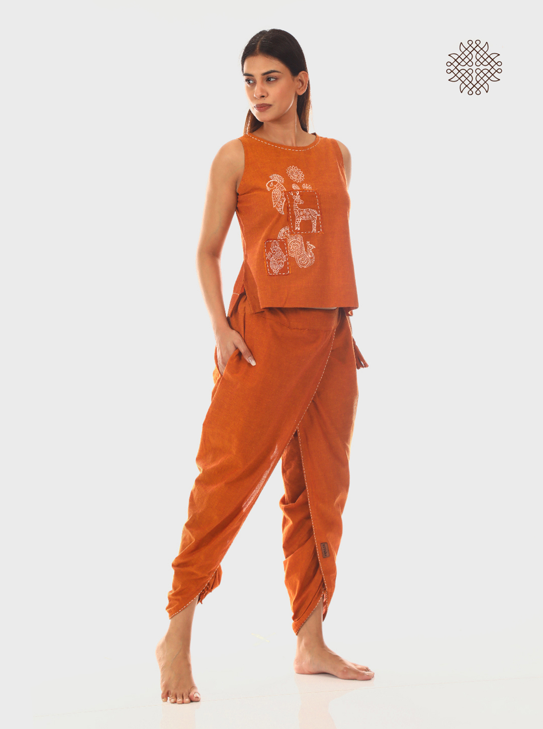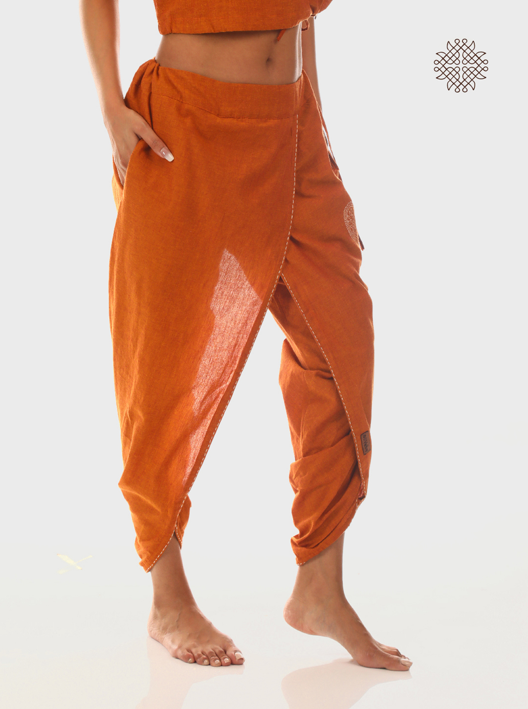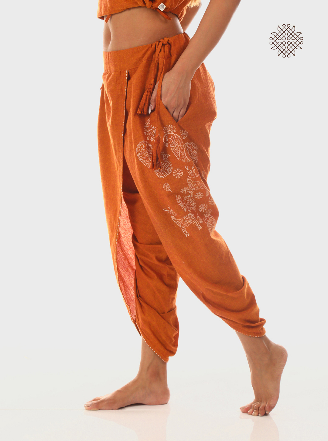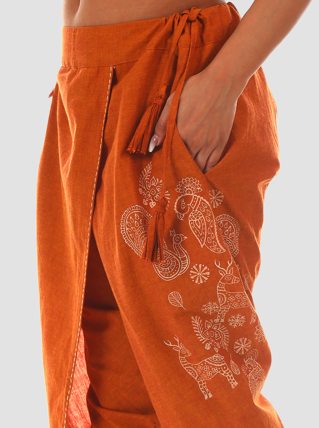 In these Kapila (Rusty brown) cross-cut dhoti pants, hand block printed deer, peacocks, and parrots move in harmony—drawn from the ancient Madhubani language of nature and soul. Each curve, a continuity of the Mithila women’s brush.