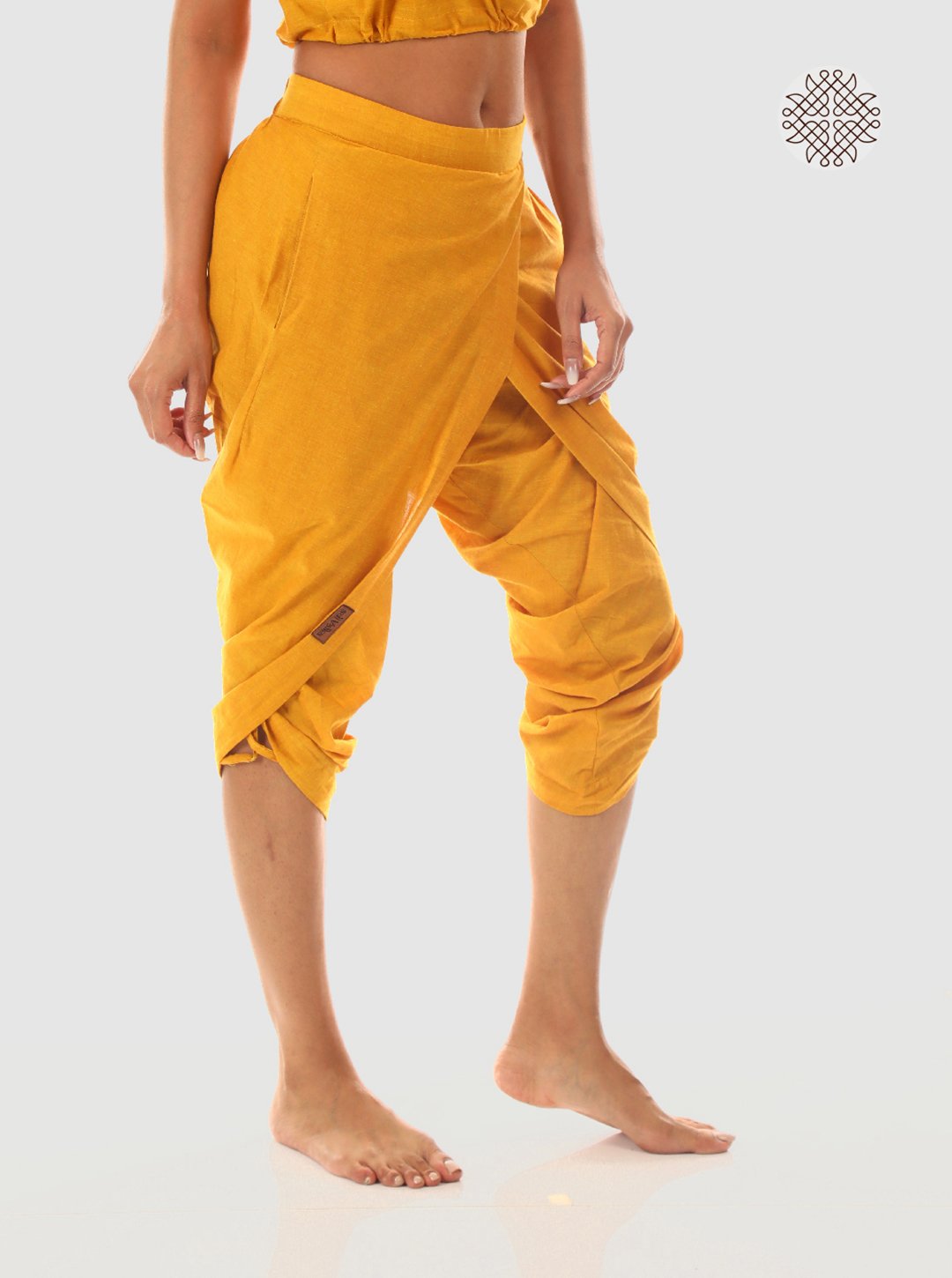 Inspired by drape styles from Uttar Pradesh and Gujarat, our haridra/Mustard Yellow taruNi, cross-cut stylish dhoti pants with pockets form a comfy wrap. Using specially curated cotton fabrics hand-picked for their superior quality, we have designed pants that are supportive for all varieties of body movements, stretches and activities. The fit is designed to be of utmost comfort and gives the wearer complete freedom of movement whether you are practicing yoga, dance or kalari payattu.