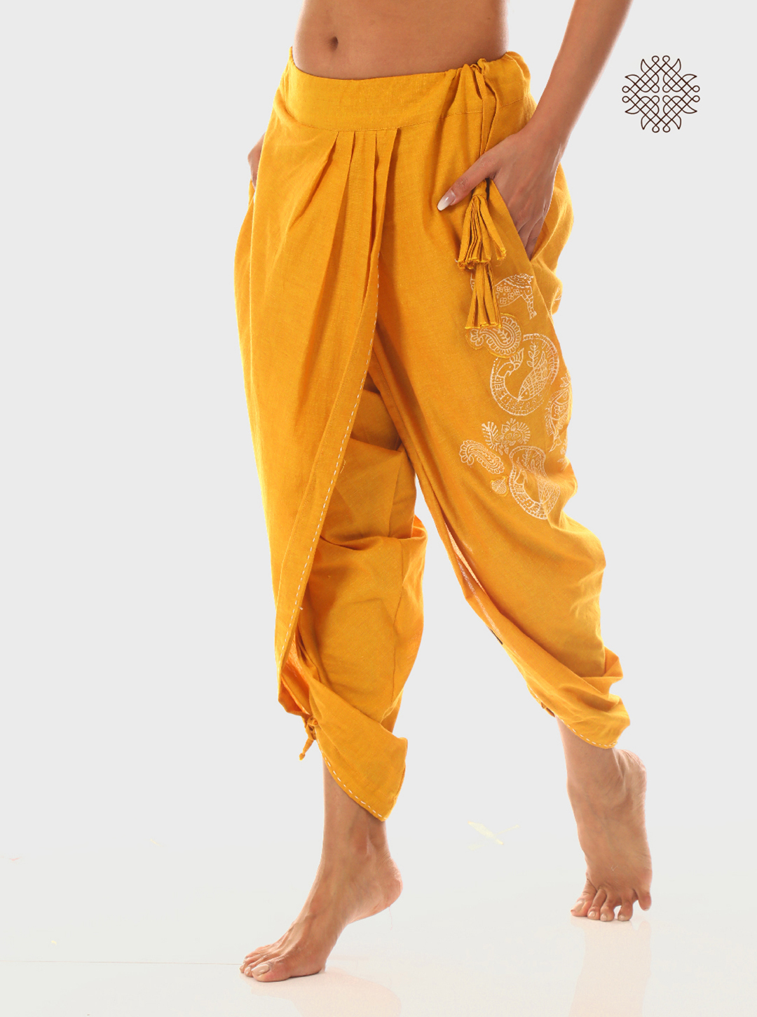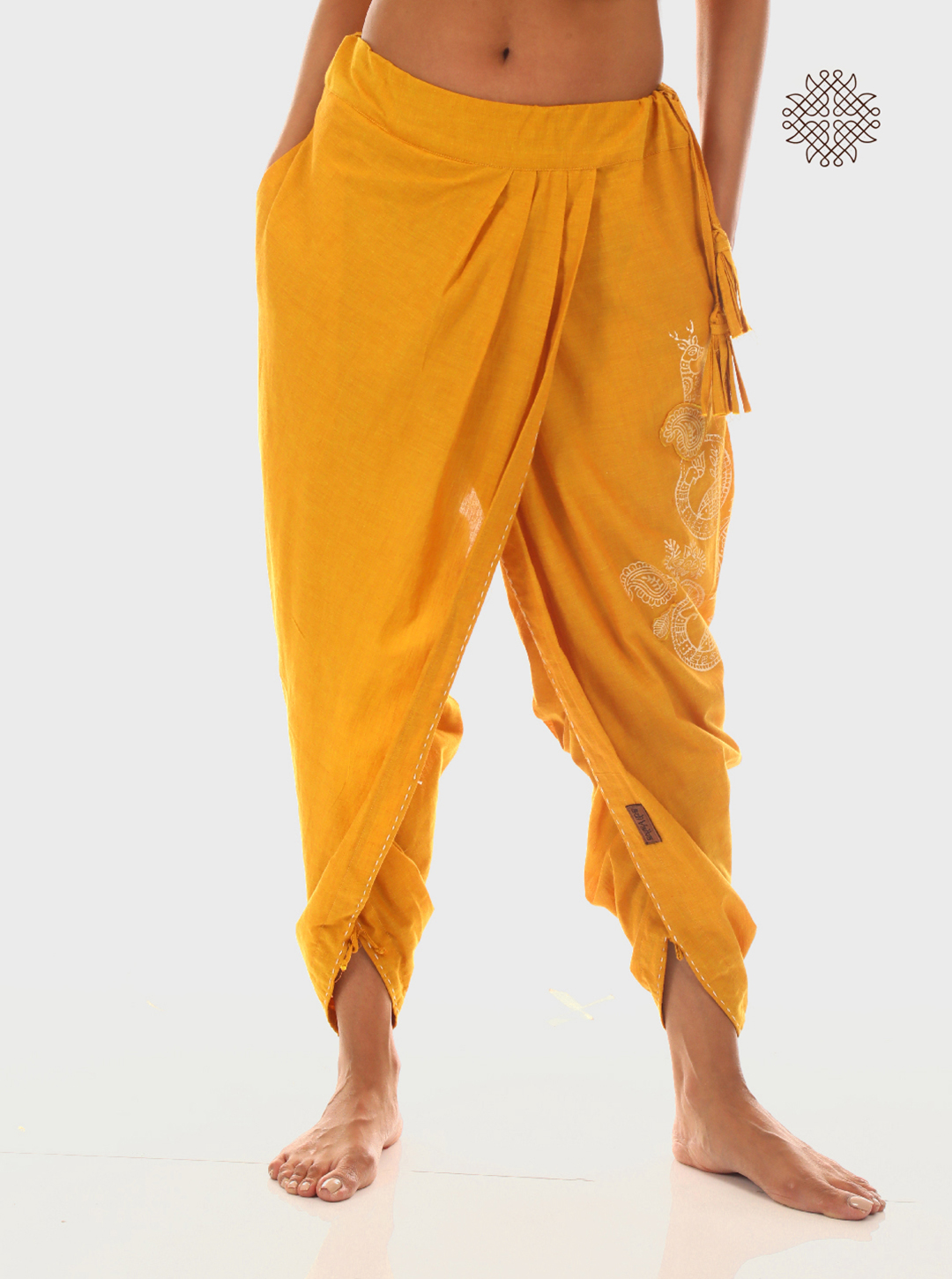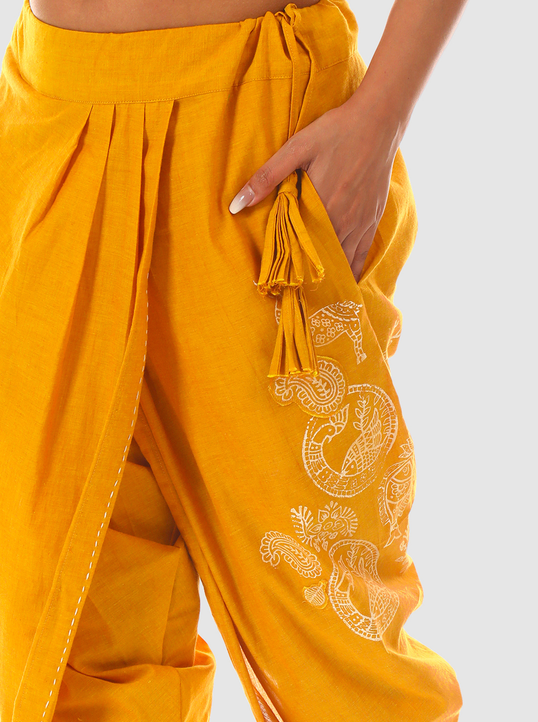 These pleated dhoti pants are hand block printed with fish, deer, and peacocks—each drawn from centuries-old Madhubani art motifs. From fertility to intuition, these symbols channel ancestral wisdom through wearable art.