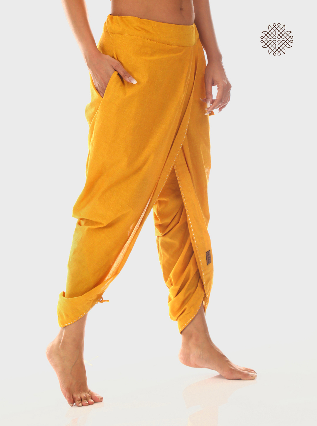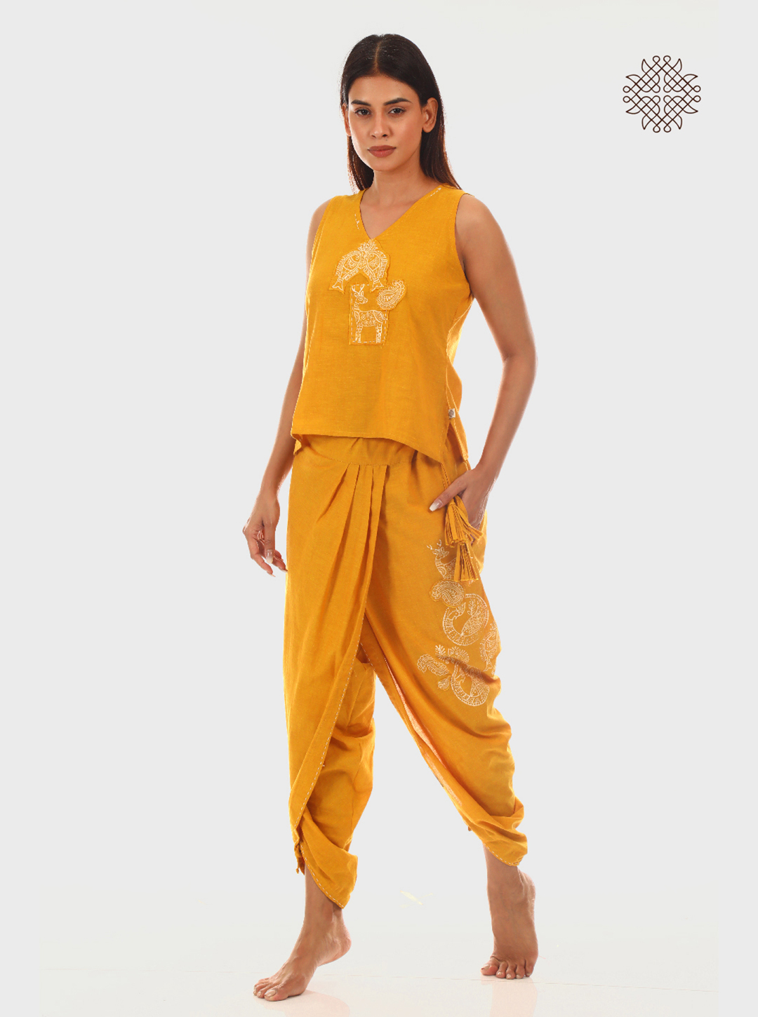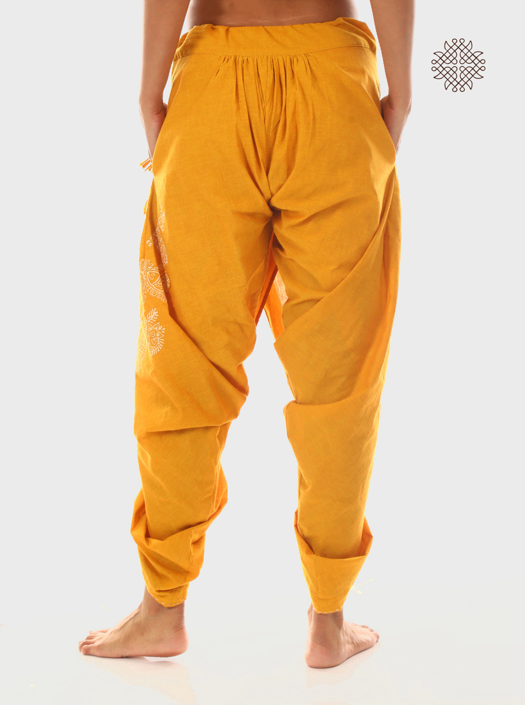 These pleated dhoti pants are hand block printed with fish, deer, and peacocks—each drawn from centuries-old Madhubani art motifs. From fertility to intuition, these symbols channel ancestral wisdom through wearable art.