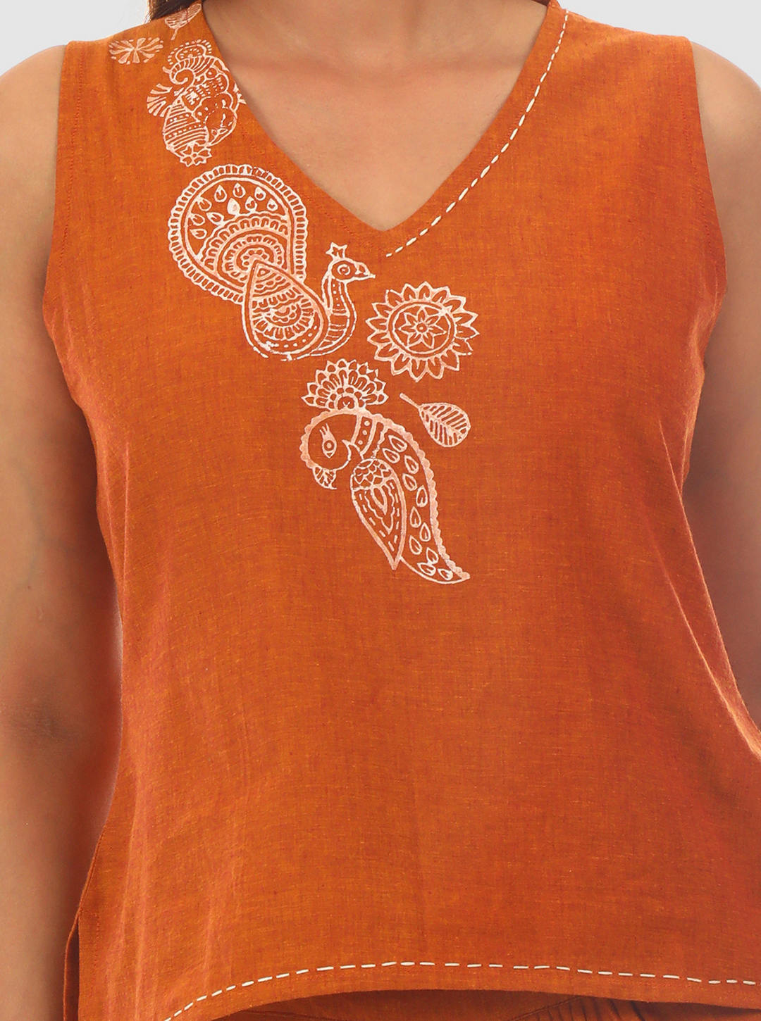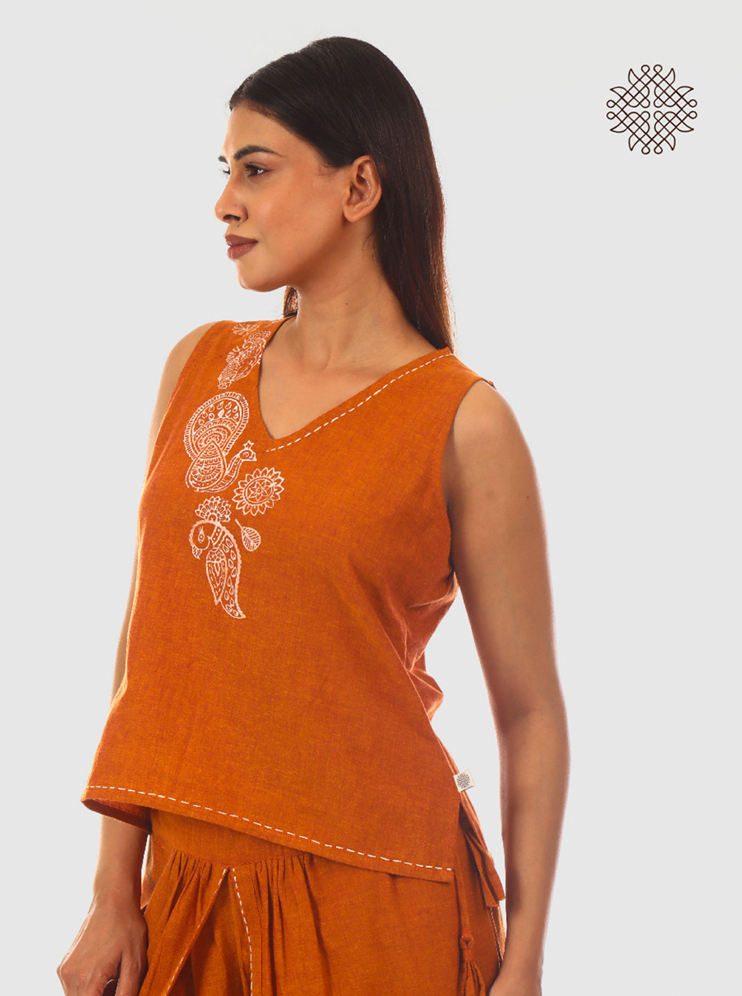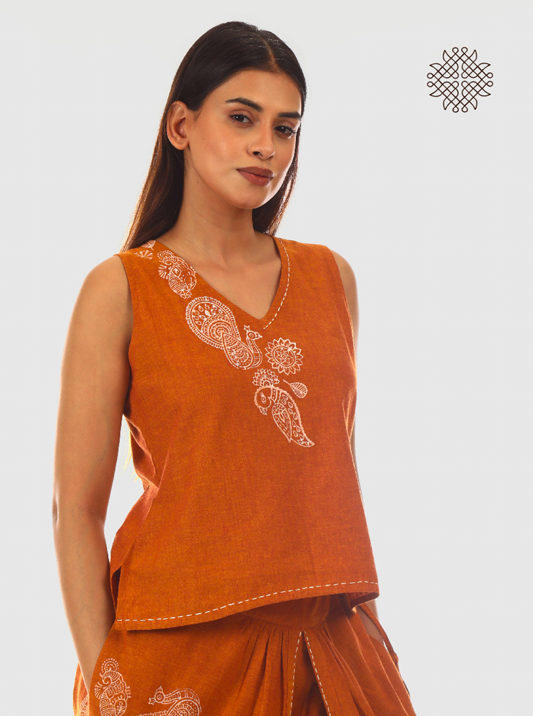 Mayura — A Kapila (rusty brown) crop top that dances with life. Hand-block printed in the Madhubani tradition, its peacocks and parrots bloom amidst foliage—symbols of love, renewal, and the soul’s joyful expression.