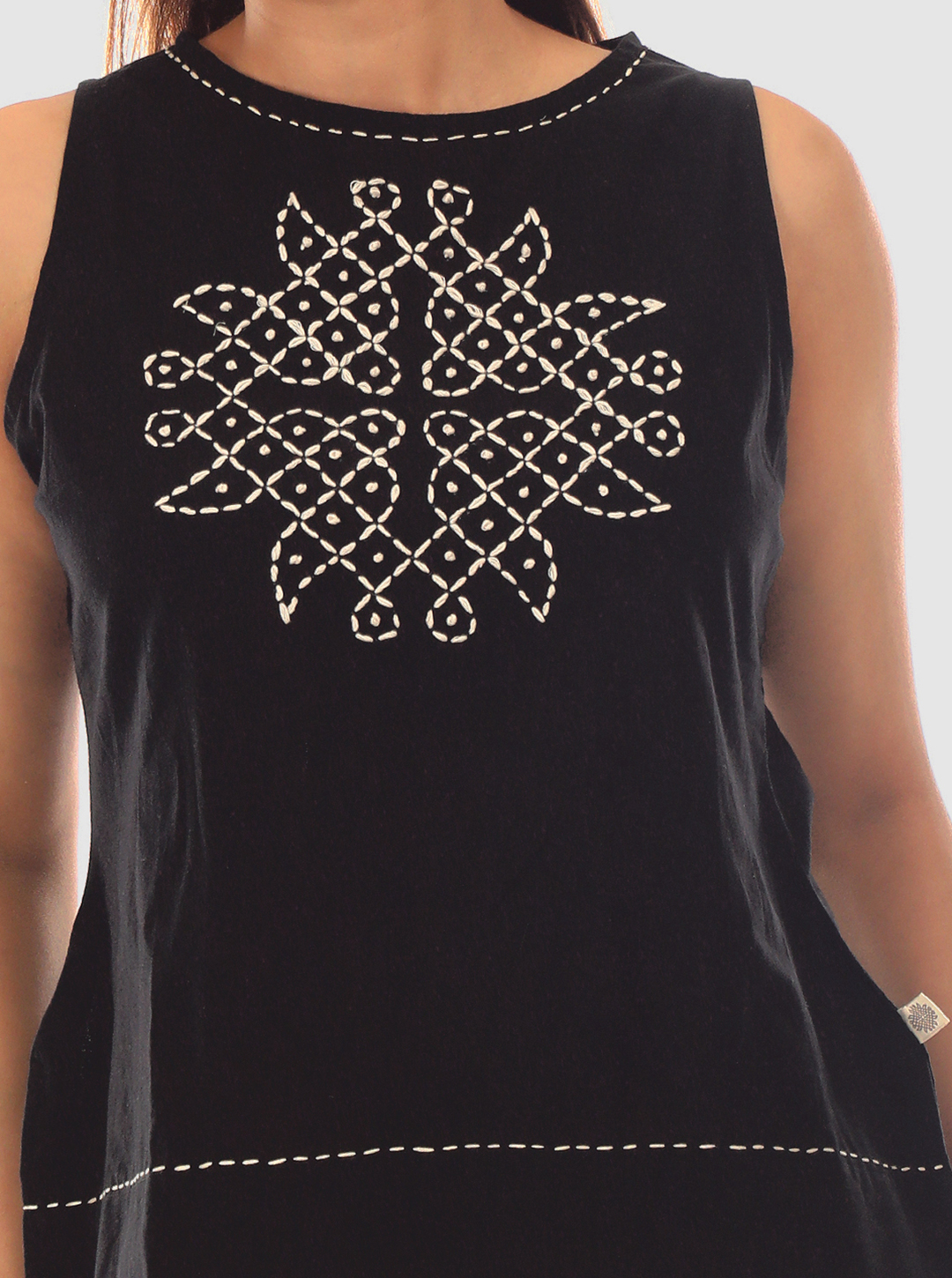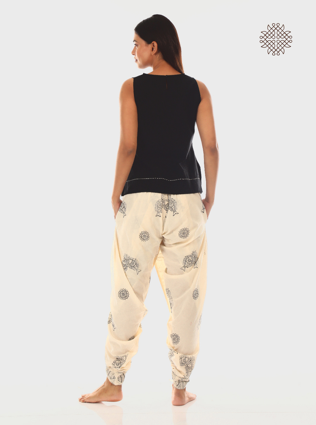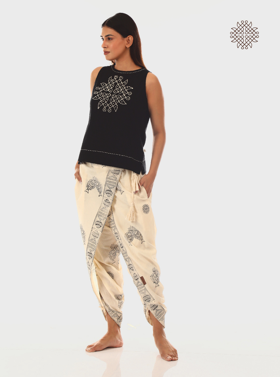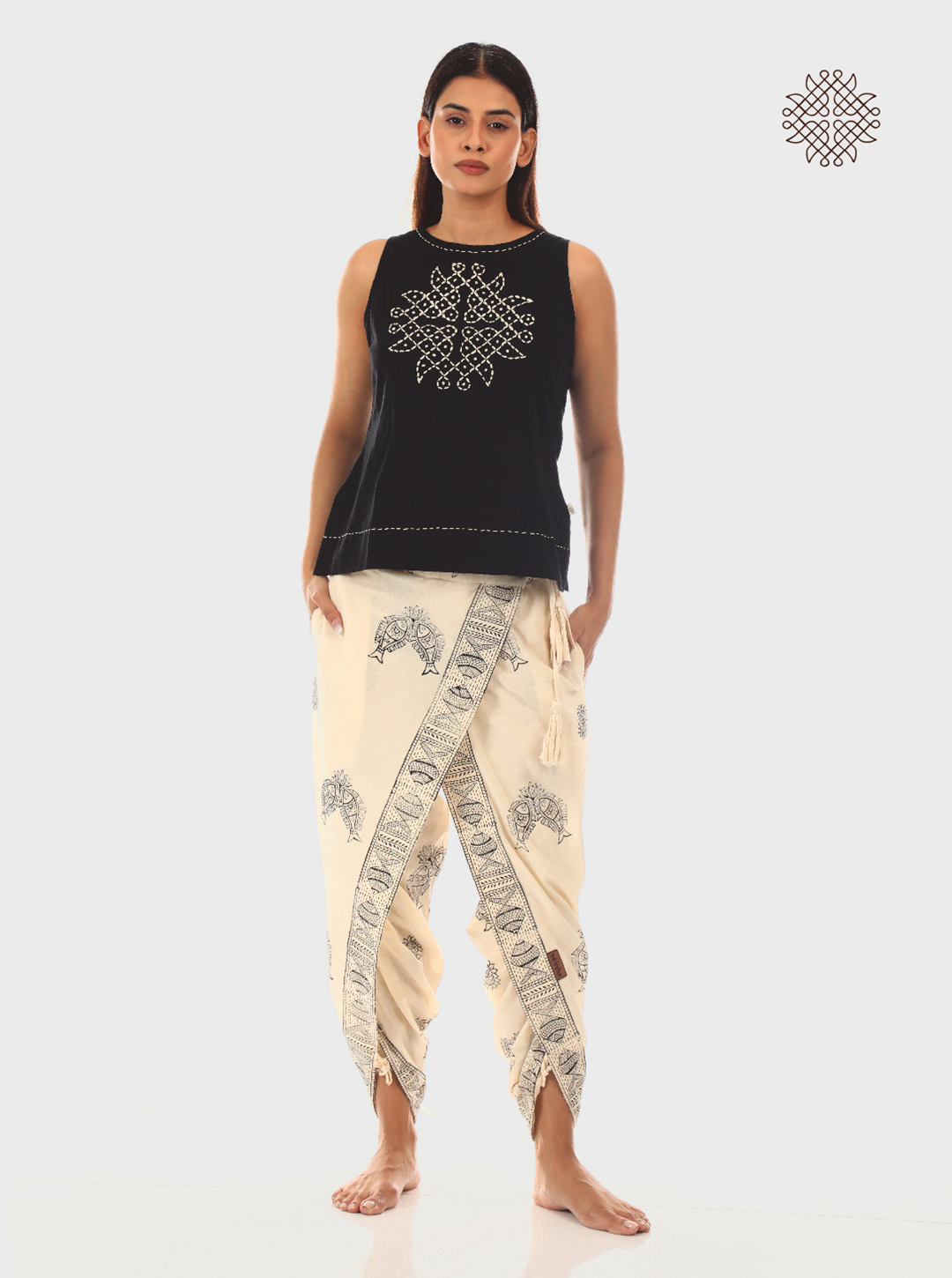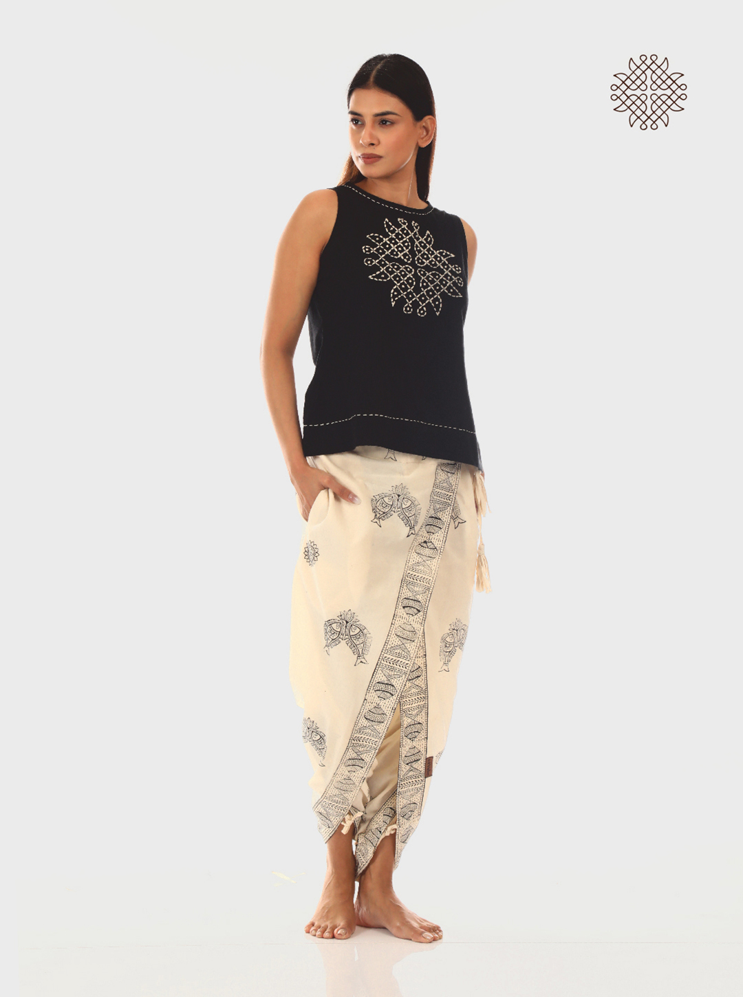 The perfect symmetry of Rangavalli flows into the riverine grace of Meena in this off-white coord set—a dance of embroidery and hand block printing — celebrating prosperity and good fortune. Mandalas and Madhubani fish create a serene dialogue of auspicious beginnings and ancestral rhythm.