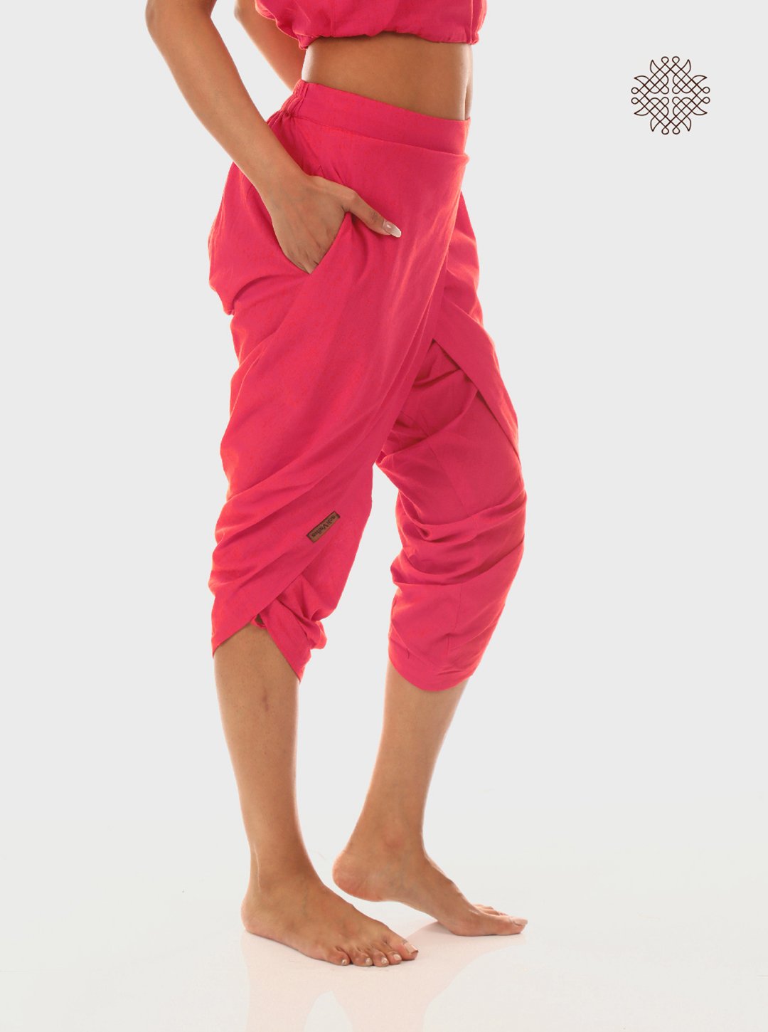 Inspired by drape styles from Uttar Pradesh and Gujarat, our pATala/Coral Pink taruNi, cross-cut stylish dhoti pants with pockets form a comfy wrap. Using specially curated cotton fabrics hand-picked for their superior quality, we have designed pants that are supportive for all varieties of body movements, stretches and activities. The fit is designed to be of utmost comfort and gives the wearer complete freedom of movement whether you are practicing yoga, dance or kalari payattu.