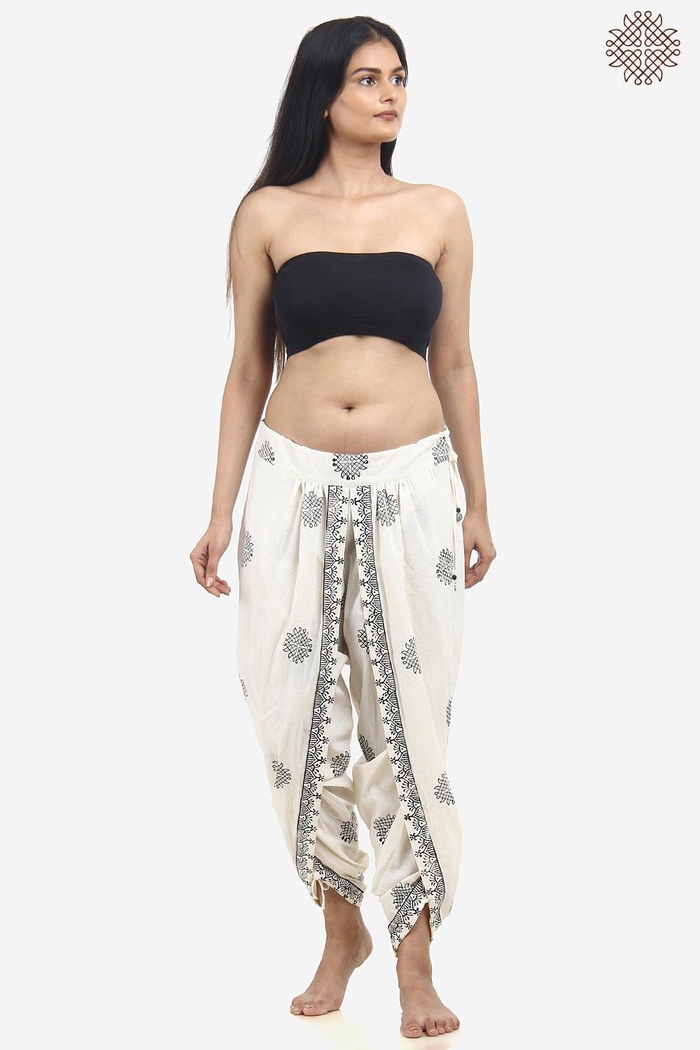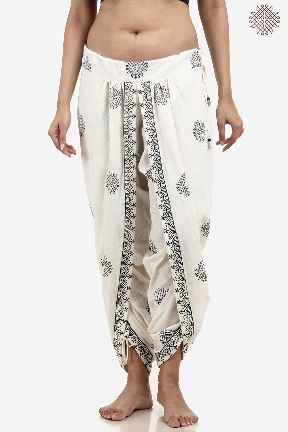 These Yuvaki Dhoti Pants with Rangavalli Motifs are crafted from 100% soft cotton. These soft cotton dhoti pants are marked by the hand-block printed motifs of the rangavalli, said to promote positivity. The hand-block printed borders and handmade tassels with the Om and yogi motifs finish the garment, giving it a chic look. Perfect as yoga pants or for a casual day out — wear them from studio to street.